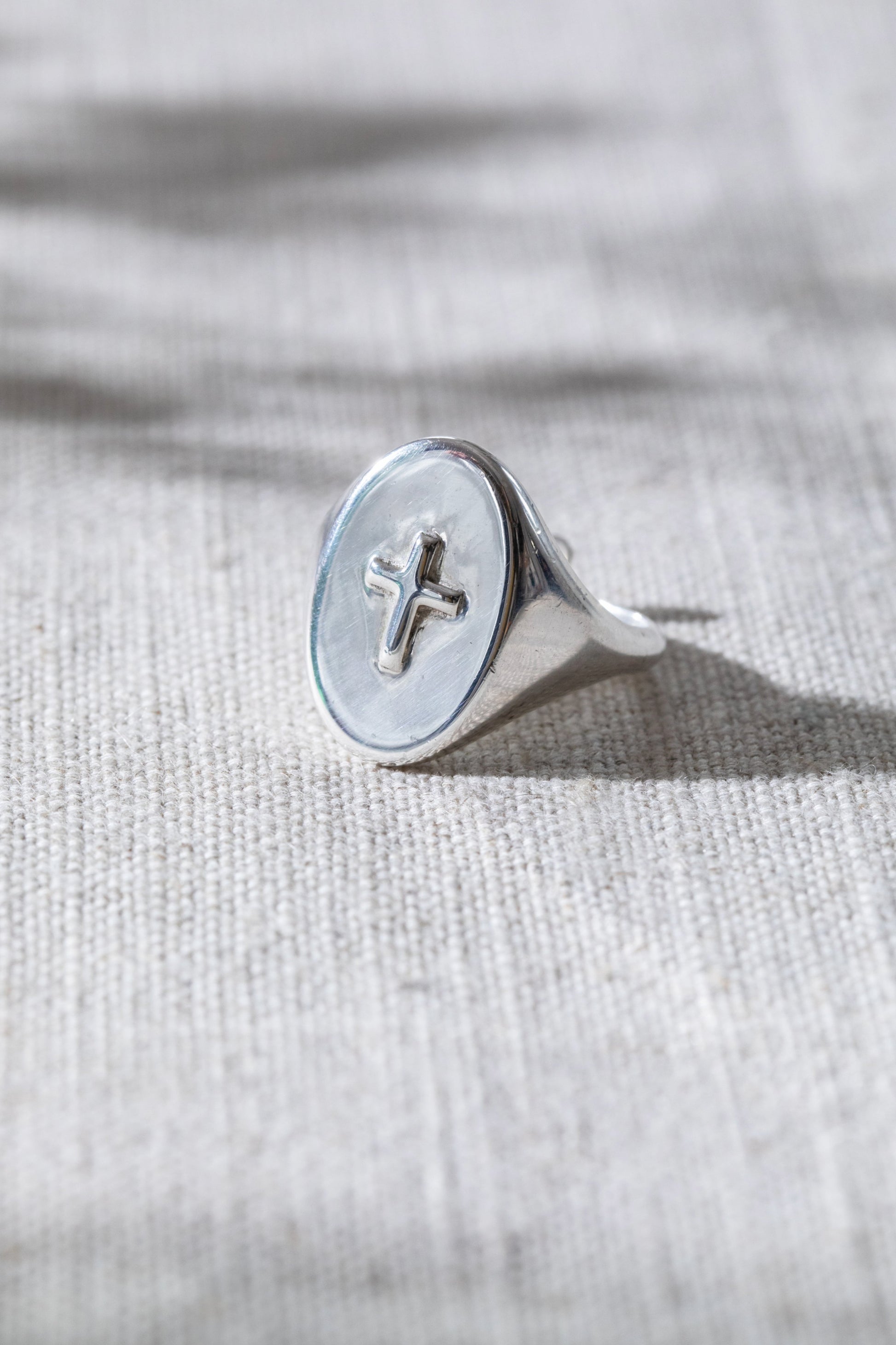 Adjustable gold cross signet ring. Available in Sterling Silver and Gold plated brass.