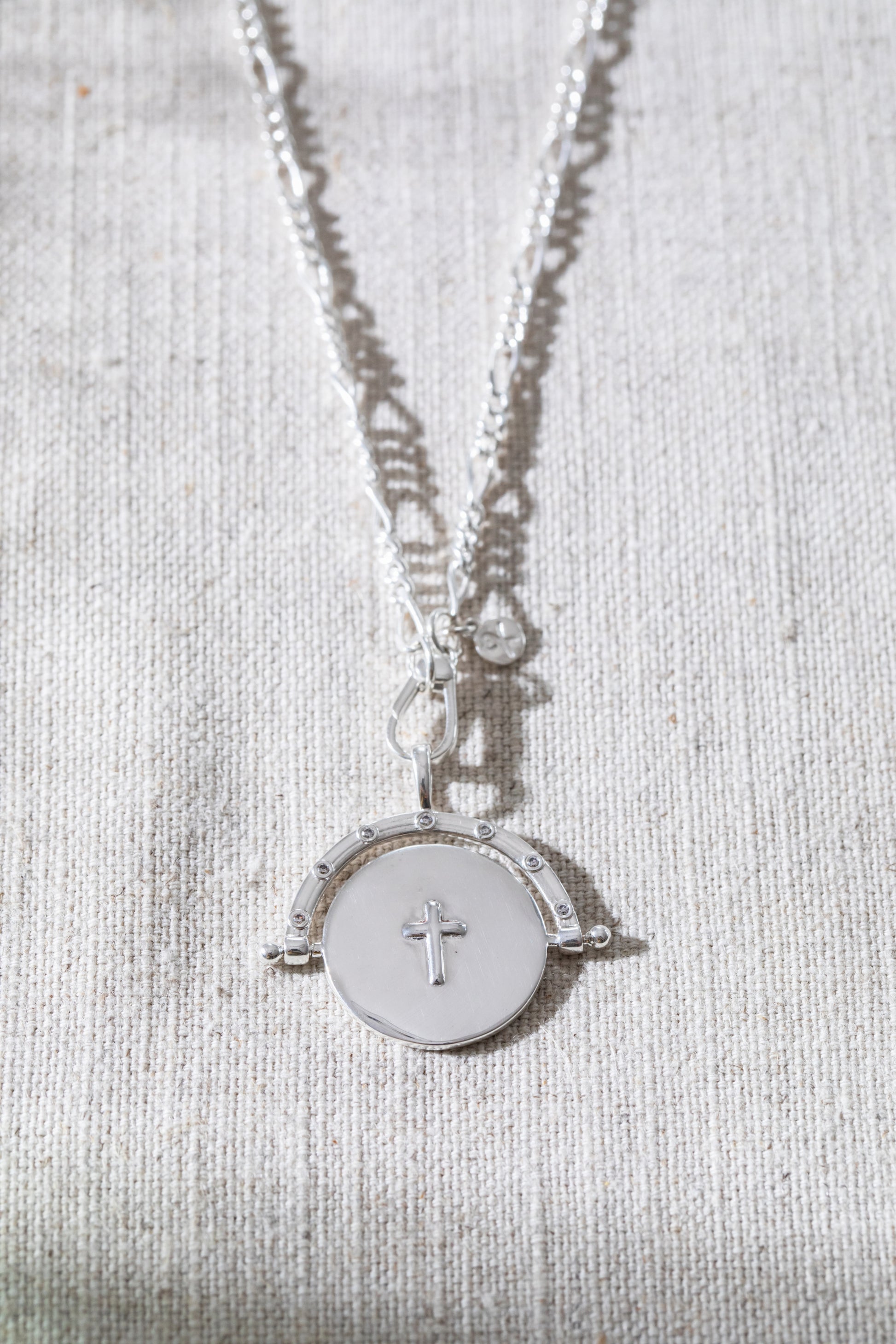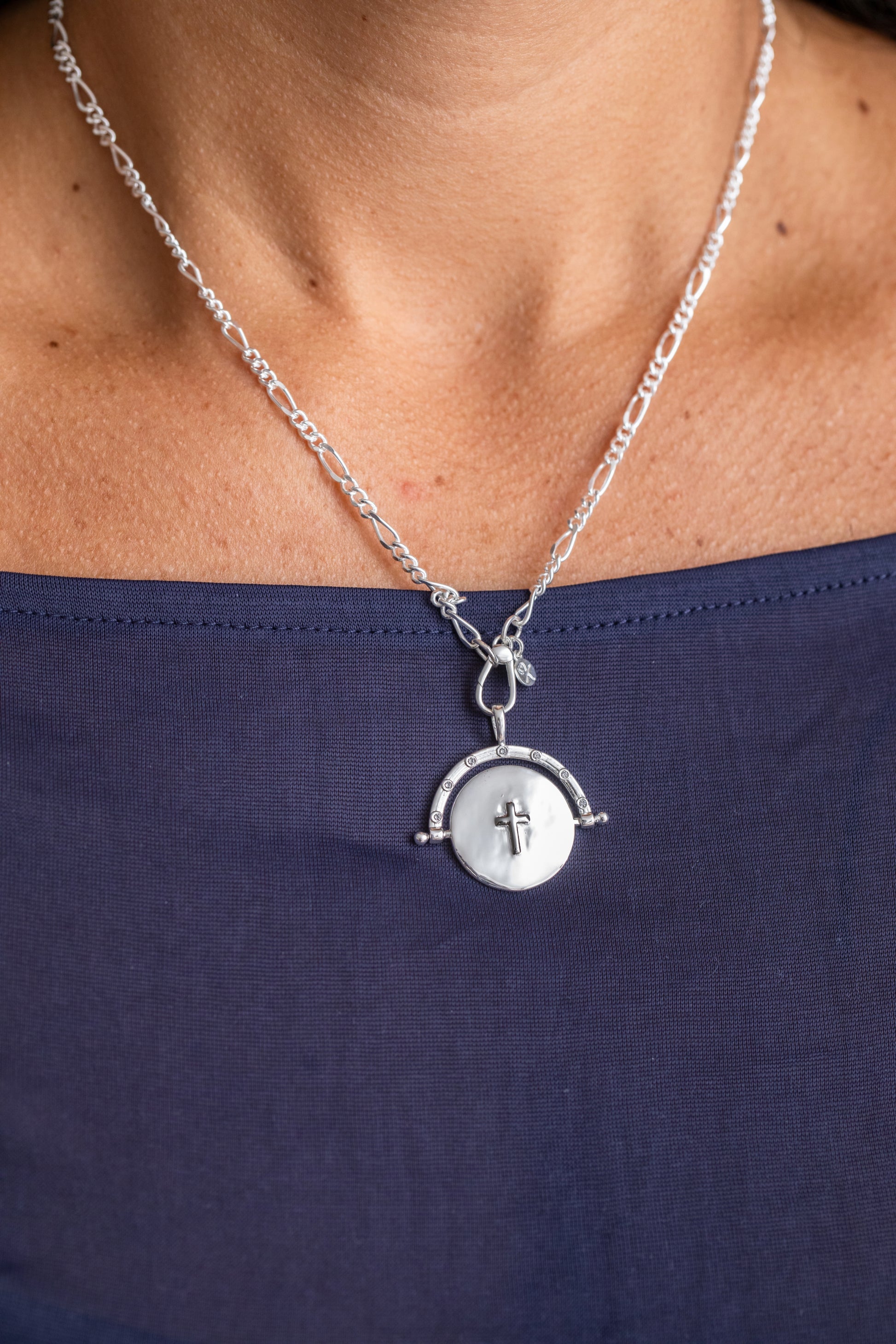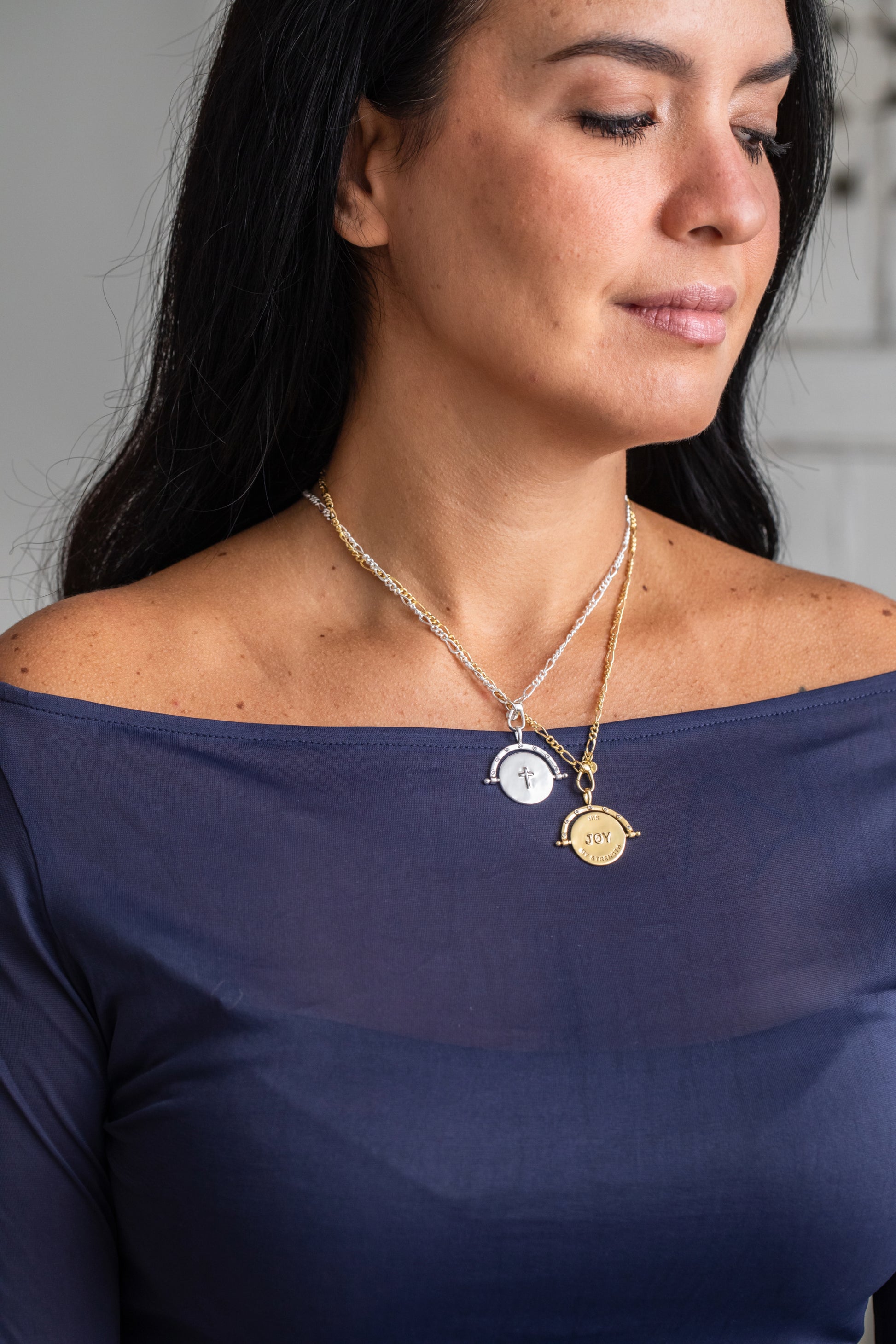 Spinning necklace engraved with His joy my strength on one side and a cross on the other.